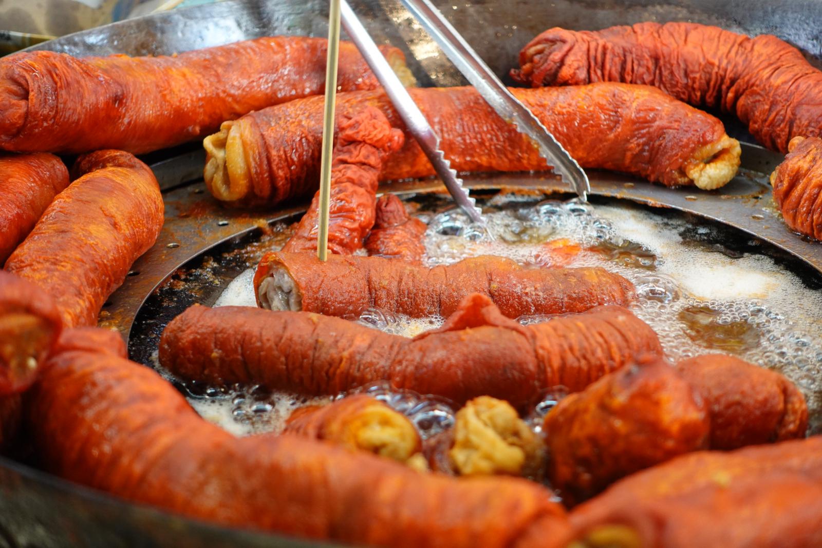 Besides stinky tofu, Delicious Food is equally famous for another local delicacy: deep-fried pork intestine. Layers of pork intestine wrapped on top of one another, deep-fried until all crispy, chopped into thick slices and skewered.