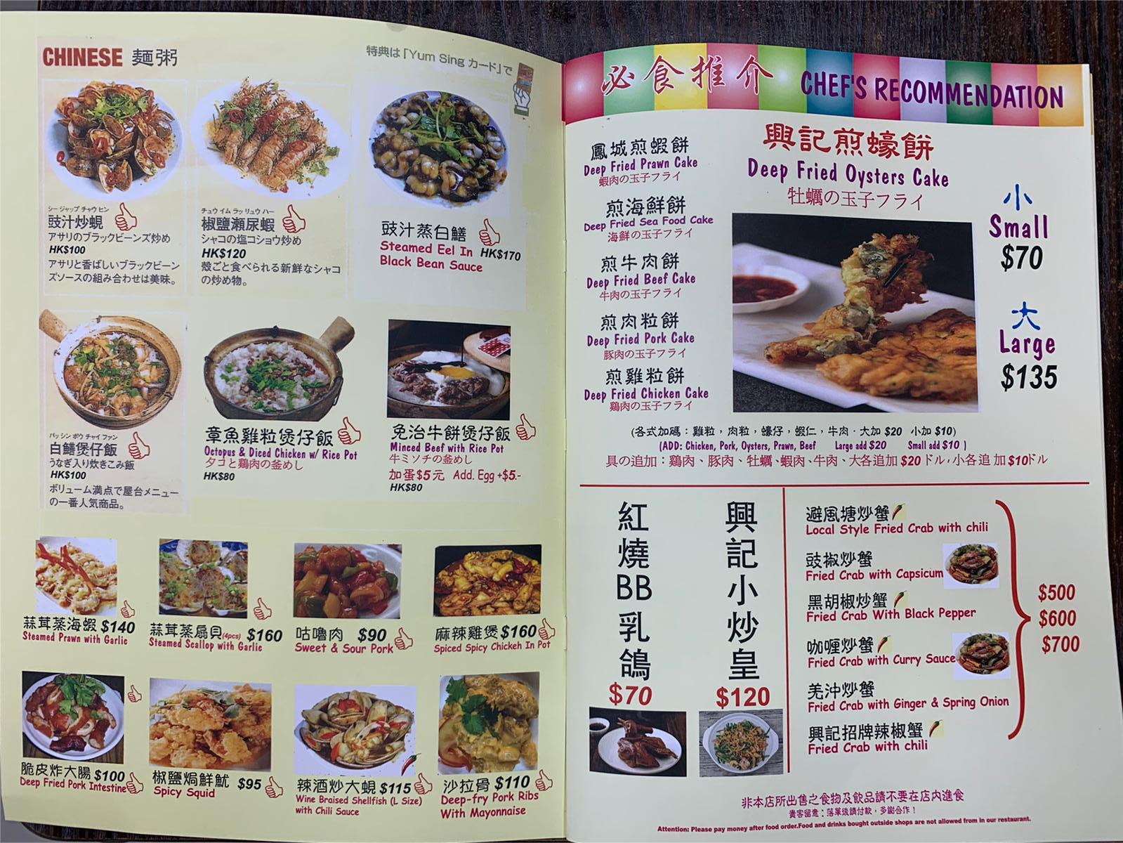 With more than 70 options priced between $50 - $100, Hing Kee's Claypot Rice menu is quite affordable compared to others in town. While it may be challenging to choose just one dish, especially for indecisive eaters, Claypot Rice with Octopus & Diced Chicken(章魚雞粒煲仔飯)and Claypot Rice with Foie gras Sausage & Chinese Sausage(臘腸潤腸煲仔飯)are always a hit and safe choice for foreigners. The intense smoky aroma and the sizzling sound of the rice make it extra comforting.